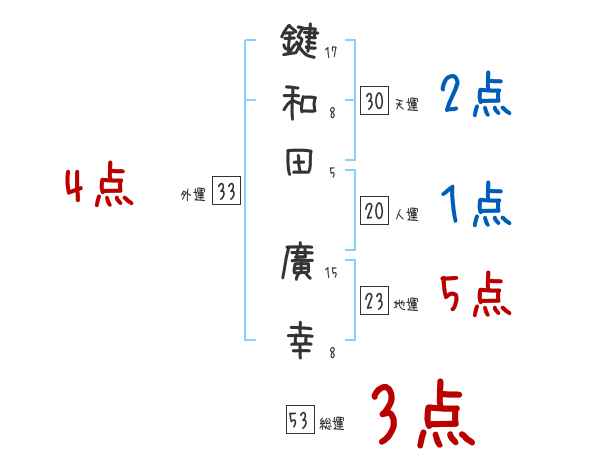 総運![]() | 鍵和田廣幸さんの総運は53画の3つ星!やや見栄っ張りで虚栄心がある。散財に注意。 あなたの人生を表す1番重要な運勢です。生涯を通じて影響する総合運となり、主に50歳以降の晩年期に影響を及ぼします。 |
