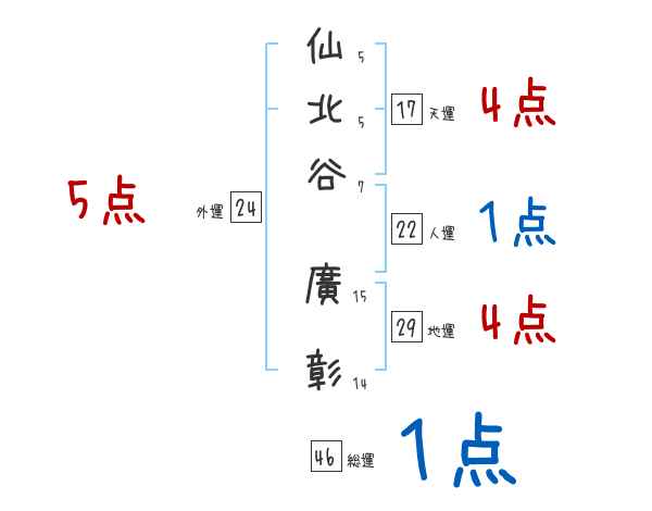 外運![]() | 仙北谷廣彰さんの外運は24画の5つ星!家庭運が良く順調な人生。金運にも恵まれる。 生活面を象徴する運勢です。外部から受ける影響力を表し、結婚運、家庭運や職場、環境への順応性を表します。 |