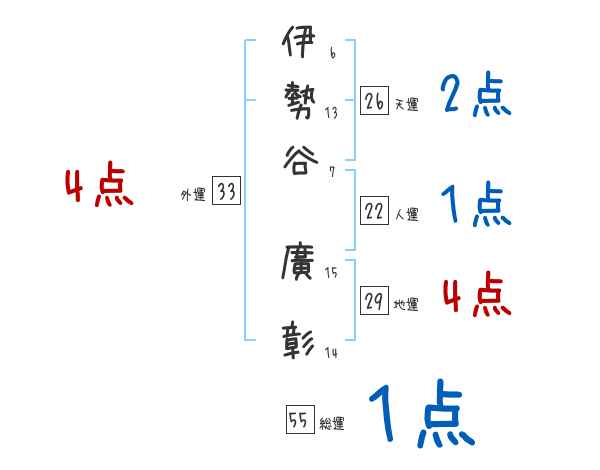 外運![]() | 伊勢谷廣彰さんの外運は33画の4つ星!権力志向でプライドが高い。勇気があり運を切り開き成功する。 生活面を象徴する運勢です。外部から受ける影響力を表し、結婚運、家庭運や職場、環境への順応性を表します。 |