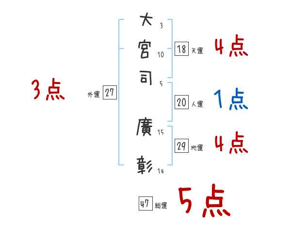天運![]() | 大宮司廣彰さんの天運は18画の4つ星!情熱的で剛気。忍耐力があり信頼される。 家系が持つ宿命的な運勢を表します。祖先から受け継いだ苗字ですので自分の力が及びません。家柄を象徴します。 |