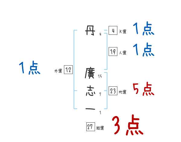 人運![]() | 丹廣志一さんの人運は19画の1つ星!優れた才能を持ちますが、協調性が足りないことも。周りの人と協力する事を意識しましょう。 性格や才能などを表す2番目に重要な運勢です。人間関係や協調性、社会的な成功に影響します。主に20歳から50歳ぐらいまでの中年期の運勢を表します。 |