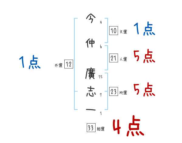 天運![]() | 今仲廣志一さんの天運は10画の1つ星!不安を感じやすい傾向。ストレスを抱えないように注意しましょう。 家系が持つ宿命的な運勢を表します。祖先から受け継いだ苗字ですので自分の力が及びません。家柄を象徴します。 |