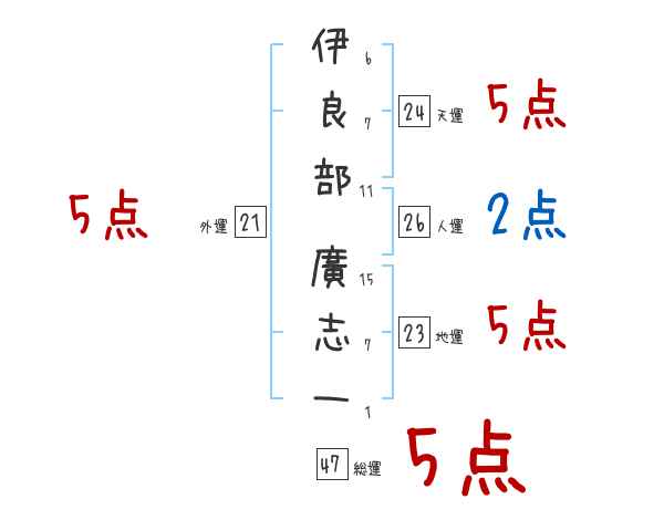 伊良部廣志一さんの画数の鑑定結果