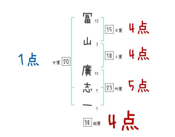 天運![]() | 冨山廣志一さんの天運は15画の4つ星!人徳があり出世する。順調に物事を進め円満な人生。 家系が持つ宿命的な運勢を表します。祖先から受け継いだ苗字ですので自分の力が及びません。家柄を象徴します。 |