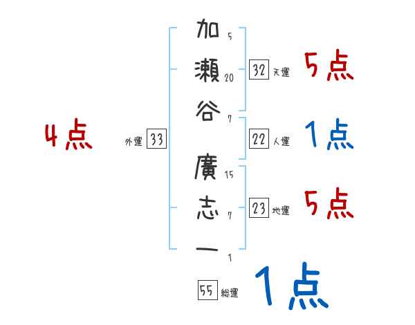 天運![]() | 加瀬谷廣志一さんの天運は32画の5つ星!柔軟性があり成功する。チャンスが多く金運が良い。 家系が持つ宿命的な運勢を表します。祖先から受け継いだ苗字ですので自分の力が及びません。家柄を象徴します。 |