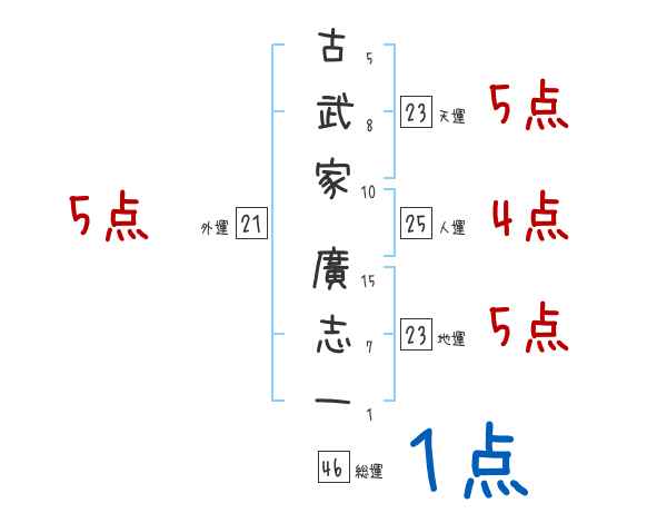 天運![]() | 古武家廣志一さんの天運は23画の5つ星!想像力に優れ活力がある。一代で成功し名誉を手に入れる。 家系が持つ宿命的な運勢を表します。祖先から受け継いだ苗字ですので自分の力が及びません。家柄を象徴します。 |