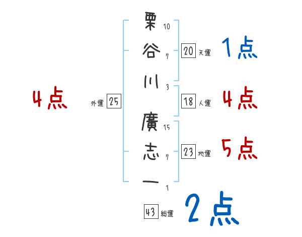 総運![]() | 栗谷川廣志一さんの総運は43画の2つ星!頑固な性格で独立心が強いかも。やや非現実的で浪費に注意しましょう。 あなたの人生を表す1番重要な運勢です。生涯を通じて影響する総合運となり、主に50歳以降の晩年期に影響を及ぼします。 |