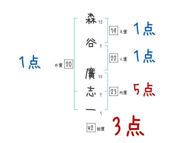 天運![]() | 森谷廣志一さんの天運は19画の1つ星!優れた才能を持ちますが、協調性が足りないことも。周りの人と協力する事を意識しましょう。 家系が持つ宿命的な運勢を表します。祖先から受け継いだ苗字ですので自分の力が及びません。家柄を象徴します。 |