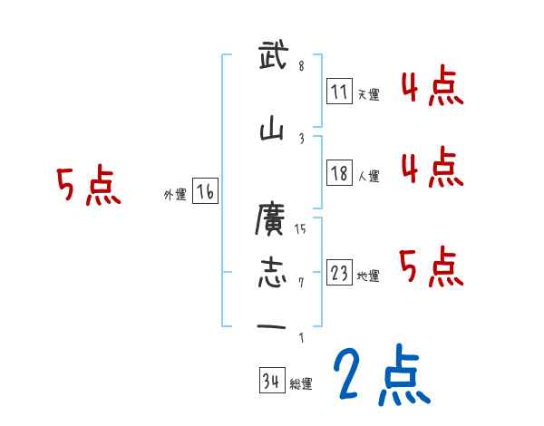 総運![]() | 武山廣志一さんの総運は34画の2つ星!独創性に優れるが、自尊心が強く災難に注意しましょう。 あなたの人生を表す1番重要な運勢です。生涯を通じて影響する総合運となり、主に50歳以降の晩年期に影響を及ぼします。 |
