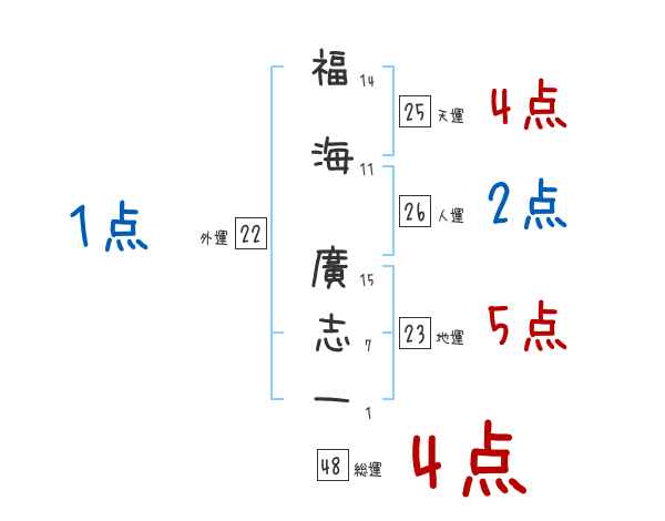 天運![]() | 福海廣志一さんの天運は25画の4つ星!個性があり才能があふれる。強運の持ち主で発展する。 家系が持つ宿命的な運勢を表します。祖先から受け継いだ苗字ですので自分の力が及びません。家柄を象徴します。 |