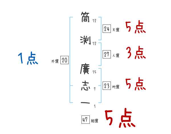 総運![]() | 筒渕廣志一さんの総運は47画の5つ星!実力が開花し発展する円満な人生。財に恵まれる。 あなたの人生を表す1番重要な運勢です。生涯を通じて影響する総合運となり、主に50歳以降の晩年期に影響を及ぼします。 |