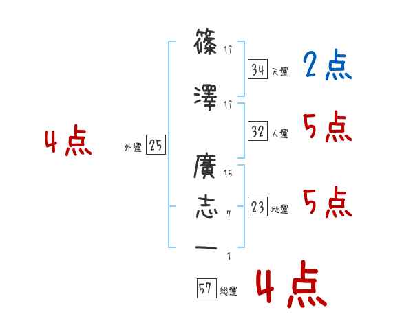 人運![]() | 篠澤廣志一さんの人運は32画の5つ星!柔軟性があり成功する。チャンスが多く金運が良い。 性格や才能などを表す2番目に重要な運勢です。人間関係や協調性、社会的な成功に影響します。主に20歳から50歳ぐらいまでの中年期の運勢を表します。 |