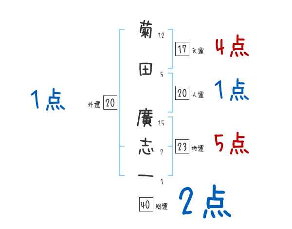 総運![]() | 菊田廣志一さんの総運は40画の2つ星!自信過剰で物事に固執するためトラブルに注意。 あなたの人生を表す1番重要な運勢です。生涯を通じて影響する総合運となり、主に50歳以降の晩年期に影響を及ぼします。 |
