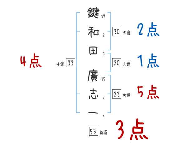 天運![]() | 鍵和田廣志一さんの天運は30画の2つ星!浮き沈みの激しさに注意しましょう。 家系が持つ宿命的な運勢を表します。祖先から受け継いだ苗字ですので自分の力が及びません。家柄を象徴します。 |