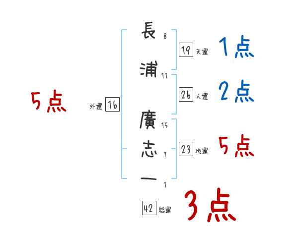 外運![]() | 長浦廣志一さんの外運は16画の5つ星!人望が厚く大きく発展する。逆転成功が見える。 生活面を象徴する運勢です。外部から受ける影響力を表し、結婚運、家庭運や職場、環境への順応性を表します。 |