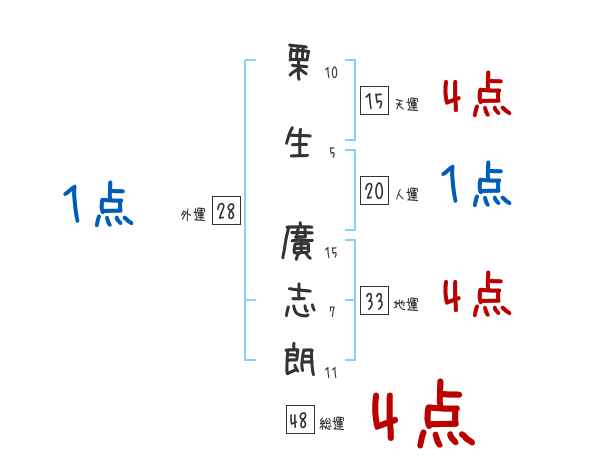 外運![]() | 栗生廣志朗さんの外運は28画の1つ星!家庭環境に注意。スポーツで活躍できる能力があるかも。 生活面を象徴する運勢です。外部から受ける影響力を表し、結婚運、家庭運や職場、環境への順応性を表します。 |