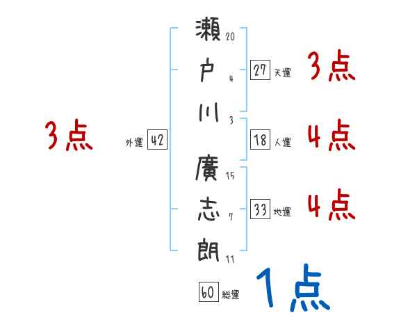 人運![]() | 瀬戸川廣志朗さんの人運は18画の4つ星!情熱的で剛気。忍耐力があり信頼される。 性格や才能などを表す2番目に重要な運勢です。人間関係や協調性、社会的な成功に影響します。主に20歳から50歳ぐらいまでの中年期の運勢を表します。 |