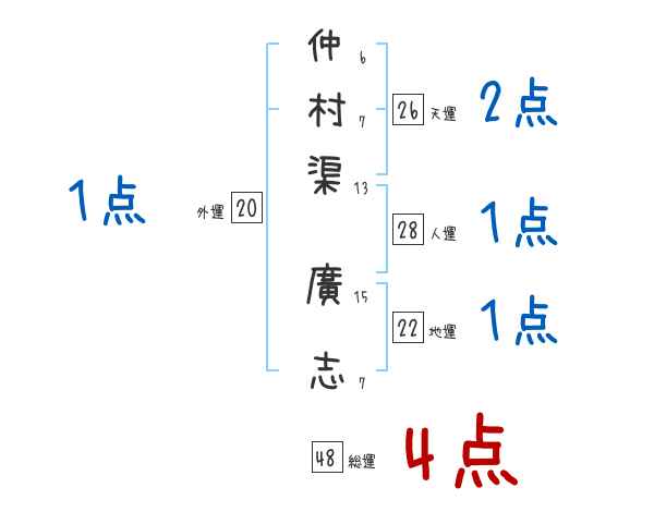 天運![]() | 仲村渠廣志さんの天運は26画の2つ星!波瀾万丈かも。信頼できる人を大事にしましょう。 家系が持つ宿命的な運勢を表します。祖先から受け継いだ苗字ですので自分の力が及びません。家柄を象徴します。 |