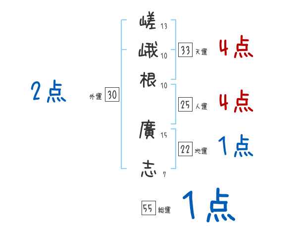 天運![]() | 嵯峨根廣志さんの天運は33画の4つ星!権力志向でプライドが高い。勇気があり運を切り開き成功する。 家系が持つ宿命的な運勢を表します。祖先から受け継いだ苗字ですので自分の力が及びません。家柄を象徴します。 |