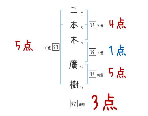 天運![]() | 二本木廣樹さんの天運は11画の4つ星!着実に富や地位を得る幸運な人生。 家系が持つ宿命的な運勢を表します。祖先から受け継いだ苗字ですので自分の力が及びません。家柄を象徴します。 |