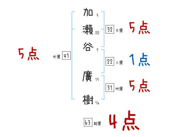 天運![]() | 加瀬谷廣樹さんの天運は32画の5つ星!柔軟性があり成功する。チャンスが多く金運が良い。 家系が持つ宿命的な運勢を表します。祖先から受け継いだ苗字ですので自分の力が及びません。家柄を象徴します。 |