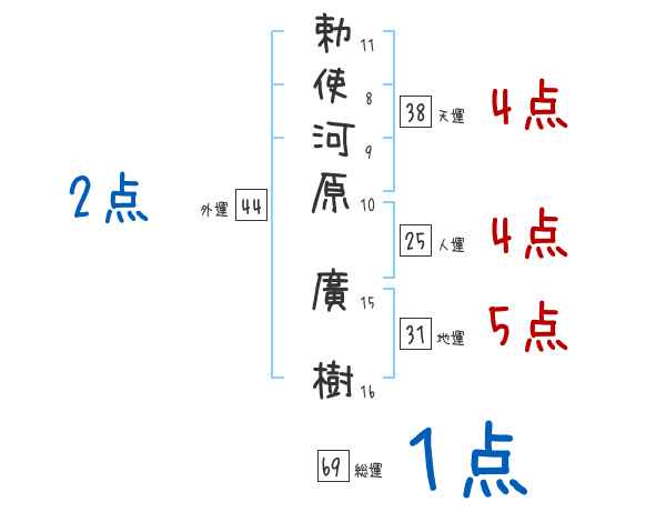 外運![]() | 勅使河原廣樹さんの外運は44画の2つ星!誠実で慎重な性格。物事を考えすぎないように注意しましょう。 生活面を象徴する運勢です。外部から受ける影響力を表し、結婚運、家庭運や職場、環境への順応性を表します。 |