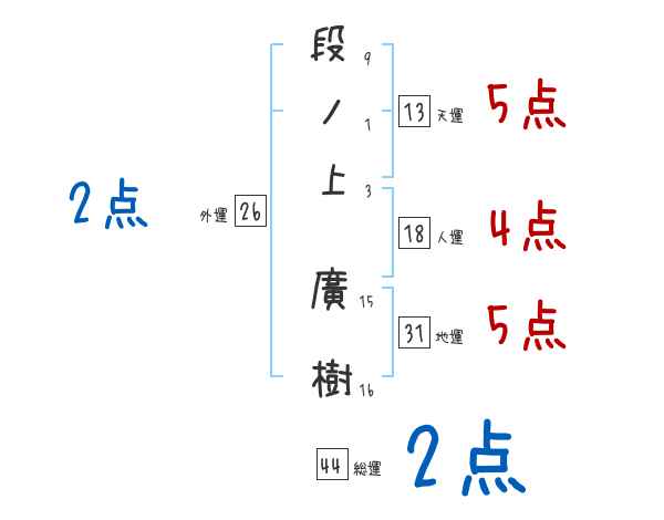外運![]() | 段ノ上廣樹さんの外運は26画の2つ星!波瀾万丈かも。信頼できる人を大事にしましょう。 生活面を象徴する運勢です。外部から受ける影響力を表し、結婚運、家庭運や職場、環境への順応性を表します。 |