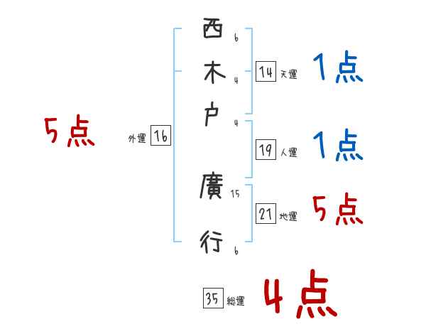 天運![]() | 西木戸廣行さんの天運は14画の1つ星!人に対して優しいがストレスを溜め込みがち。人間関係のトラブルを避けるよう気をつけましょう。 家系が持つ宿命的な運勢を表します。祖先から受け継いだ苗字ですので自分の力が及びません。家柄を象徴します。 |