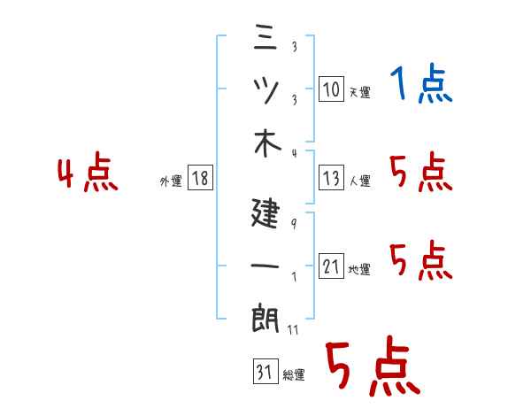 人運![]() | 三ツ木建一朗さんの人運は13画の5つ星!才能に恵まれ人気がある。名声を手に入れる。円満な人生。 性格や才能などを表す2番目に重要な運勢です。人間関係や協調性、社会的な成功に影響します。主に20歳から50歳ぐらいまでの中年期の運勢を表します。 |