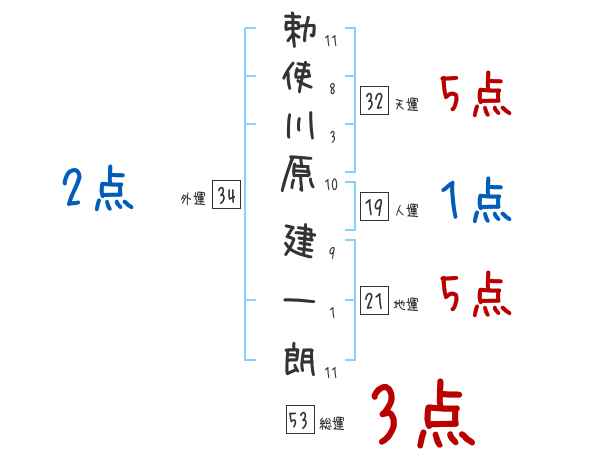 天運![]() | 勅使川原建一朗さんの天運は32画の5つ星!柔軟性があり成功する。チャンスが多く金運が良い。 家系が持つ宿命的な運勢を表します。祖先から受け継いだ苗字ですので自分の力が及びません。家柄を象徴します。 |