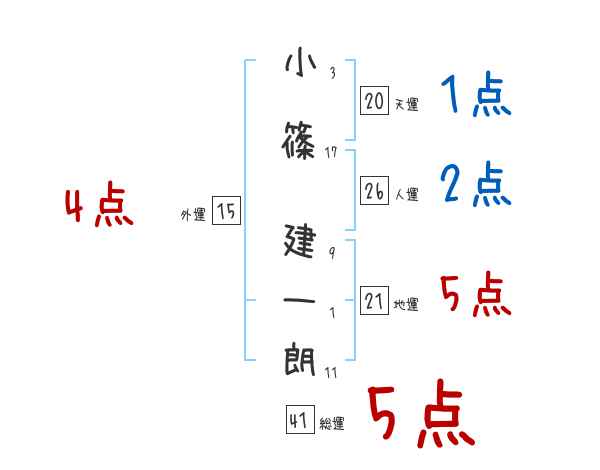外運![]() | 小篠建一朗さんの外運は15画の4つ星!人徳があり出世する。順調に物事を進め円満な人生。 生活面を象徴する運勢です。外部から受ける影響力を表し、結婚運、家庭運や職場、環境への順応性を表します。 |