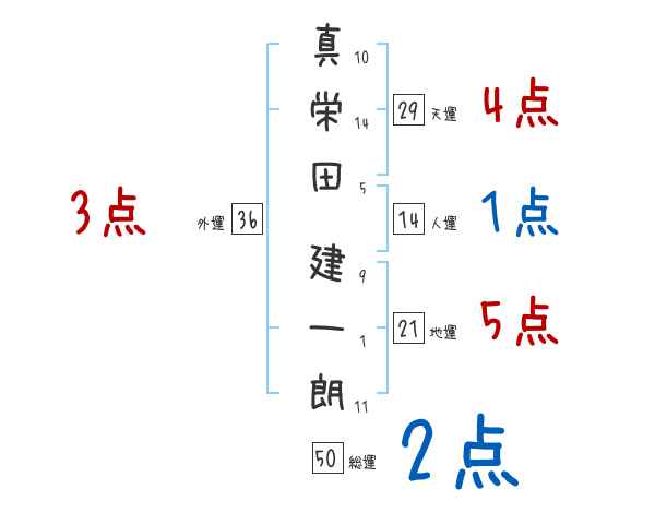 天運![]() | 真栄田建一朗さんの天運は29画の4つ星!完全主義で才能がある。厳格な心の持ち主。 家系が持つ宿命的な運勢を表します。祖先から受け継いだ苗字ですので自分の力が及びません。家柄を象徴します。 |