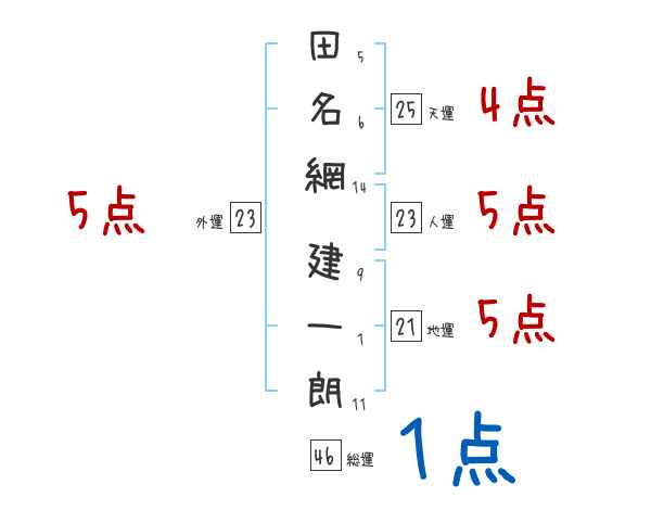 外運![]() | 田名網建一朗さんの外運は23画の5つ星!想像力に優れ活力がある。一代で成功し名誉を手に入れる。 生活面を象徴する運勢です。外部から受ける影響力を表し、結婚運、家庭運や職場、環境への順応性を表します。 |