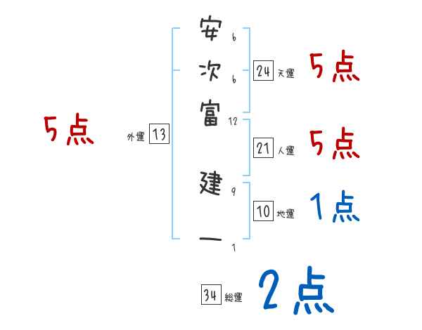 人運![]() | 安次富建一さんの人運は21画の5つ星!統率力がある。独立し成功する。名誉を手に入れる。 性格や才能などを表す2番目に重要な運勢です。人間関係や協調性、社会的な成功に影響します。主に20歳から50歳ぐらいまでの中年期の運勢を表します。 |
