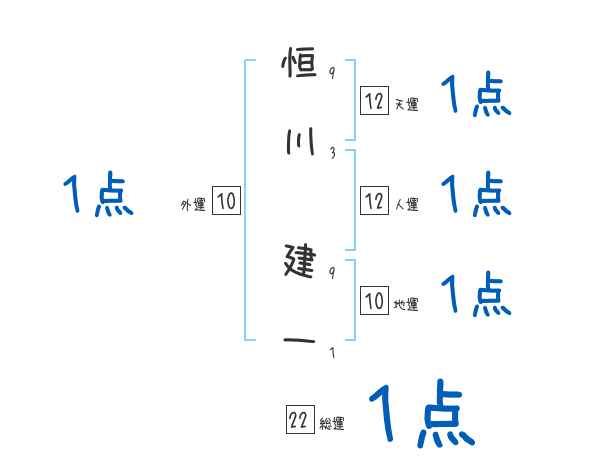 天運![]() | 恒川建一さんの天運は12画の1つ星!簡単な失敗で諦めてしまいやすいかも。着実に行動すると良いでしょう。 家系が持つ宿命的な運勢を表します。祖先から受け継いだ苗字ですので自分の力が及びません。家柄を象徴します。 |