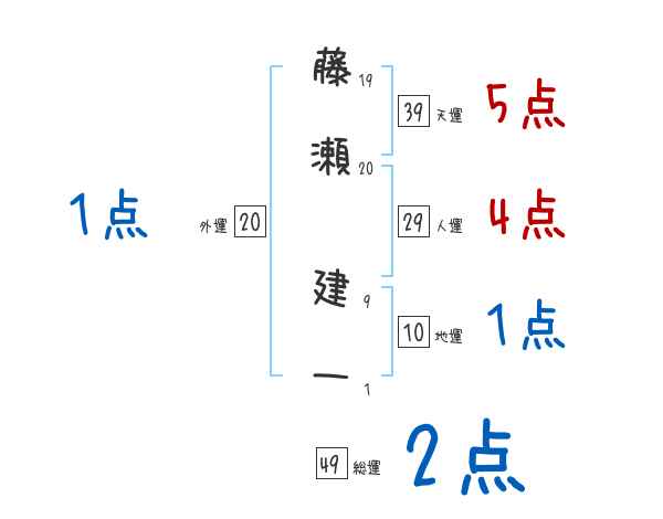 天運![]() | 藤瀬建一さんの天運は39画の5つ星!社交性に優れ人望が厚い。人の上に立ち成功する。 家系が持つ宿命的な運勢を表します。祖先から受け継いだ苗字ですので自分の力が及びません。家柄を象徴します。 |