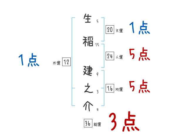外運![]() | 生稲建之介さんの外運は12画の1つ星!簡単な失敗で諦めてしまいやすいかも。着実に行動すると良いでしょう。 生活面を象徴する運勢です。外部から受ける影響力を表し、結婚運、家庭運や職場、環境への順応性を表します。 |