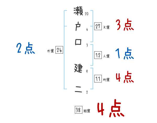 外運![]() | 瀬戸口建二さんの外運は26画の2つ星!波瀾万丈かも。信頼できる人を大事にしましょう。 生活面を象徴する運勢です。外部から受ける影響力を表し、結婚運、家庭運や職場、環境への順応性を表します。 |