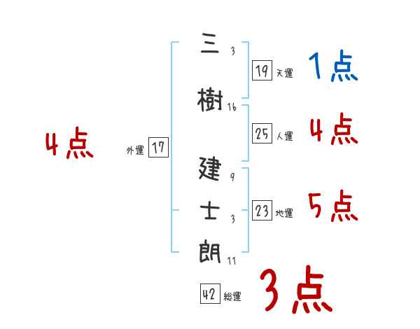 外運![]() | 三樹建士朗さんの外運は17画の4つ星!積極的な行動力。地位を気づき財産を手に入れる。純粋な心と直感力。 生活面を象徴する運勢です。外部から受ける影響力を表し、結婚運、家庭運や職場、環境への順応性を表します。 |