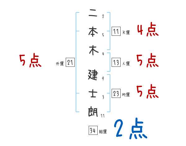 天運![]() | 二本木建士朗さんの天運は11画の4つ星!着実に富や地位を得る幸運な人生。 家系が持つ宿命的な運勢を表します。祖先から受け継いだ苗字ですので自分の力が及びません。家柄を象徴します。 |