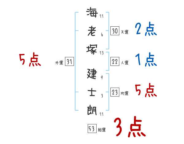 総運![]() | 海老塚建士朗さんの総運は53画の3つ星!やや見栄っ張りで虚栄心がある。散財に注意。 あなたの人生を表す1番重要な運勢です。生涯を通じて影響する総合運となり、主に50歳以降の晩年期に影響を及ぼします。 |