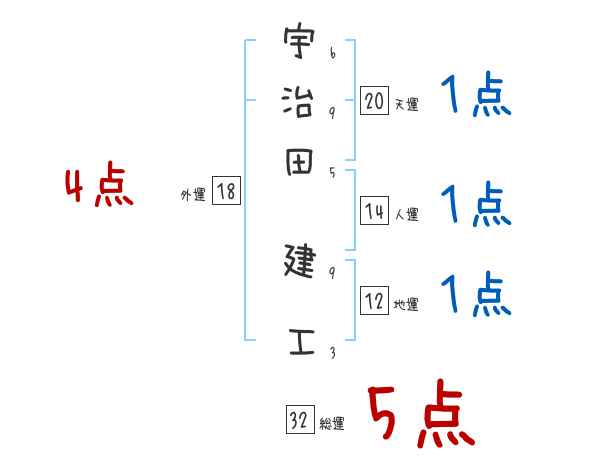 総運![]() | 宇治田建工さんの総運は32画の5つ星!柔軟性があり成功する。チャンスが多く金運が良い。 あなたの人生を表す1番重要な運勢です。生涯を通じて影響する総合運となり、主に50歳以降の晩年期に影響を及ぼします。 |