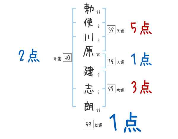 天運![]() | 勅使川原建志朗さんの天運は32画の5つ星!柔軟性があり成功する。チャンスが多く金運が良い。 家系が持つ宿命的な運勢を表します。祖先から受け継いだ苗字ですので自分の力が及びません。家柄を象徴します。 |