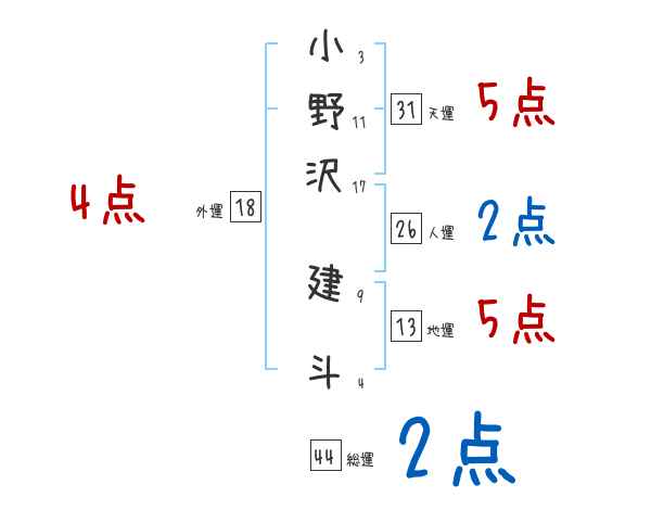 総運![]() | 小野沢建斗さんの総運は44画の2つ星!誠実で慎重な性格。物事を考えすぎないように注意しましょう。 あなたの人生を表す1番重要な運勢です。生涯を通じて影響する総合運となり、主に50歳以降の晩年期に影響を及ぼします。 |