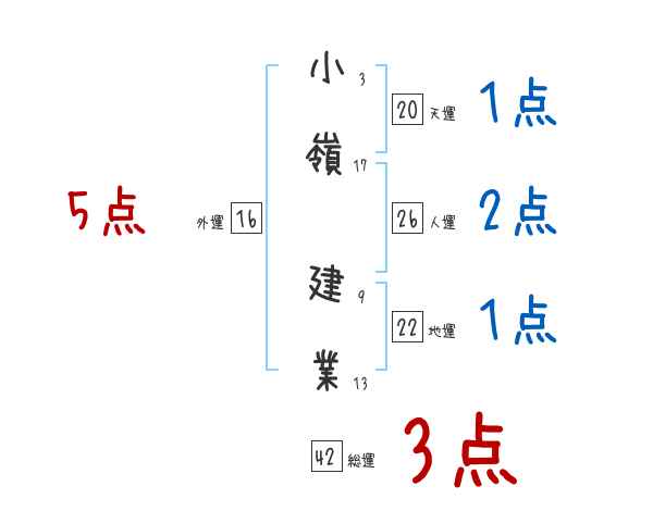 外運![]() | 小嶺建業さんの外運は16画の5つ星!人望が厚く大きく発展する。逆転成功が見える。 生活面を象徴する運勢です。外部から受ける影響力を表し、結婚運、家庭運や職場、環境への順応性を表します。 |