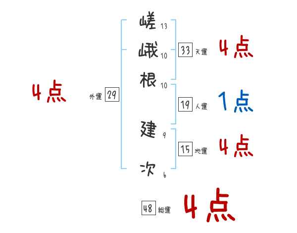 天運![]() | 嵯峨根建次さんの天運は33画の4つ星!権力志向でプライドが高い。勇気があり運を切り開き成功する。 家系が持つ宿命的な運勢を表します。祖先から受け継いだ苗字ですので自分の力が及びません。家柄を象徴します。 |