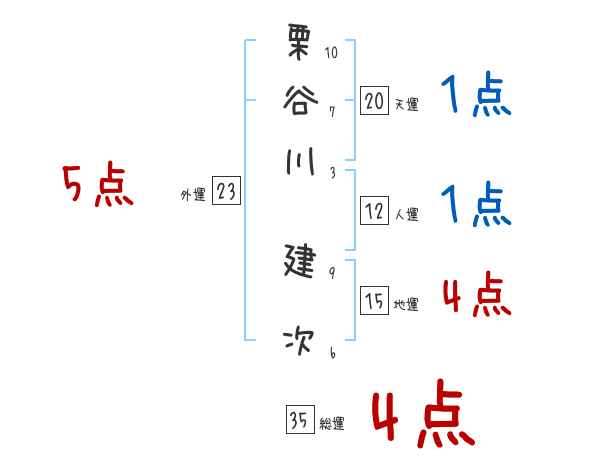 外運![]() | 栗谷川建次さんの外運は23画の5つ星!想像力に優れ活力がある。一代で成功し名誉を手に入れる。 生活面を象徴する運勢です。外部から受ける影響力を表し、結婚運、家庭運や職場、環境への順応性を表します。 |