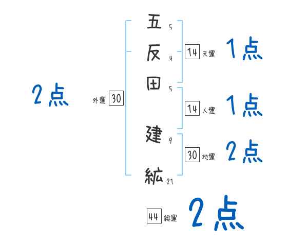 総運![]() | 五反田建絋さんの総運は44画の2つ星!誠実で慎重な性格。物事を考えすぎないように注意しましょう。 あなたの人生を表す1番重要な運勢です。生涯を通じて影響する総合運となり、主に50歳以降の晩年期に影響を及ぼします。 |