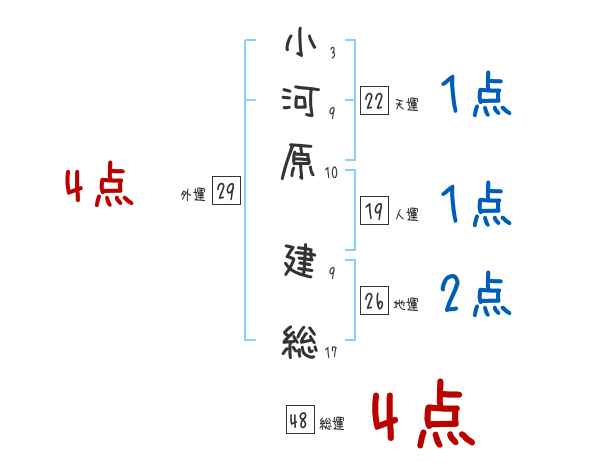 天運![]() | 小河原建総さんの天運は22画の1つ星!努力することが苦手ないっぽう手先が器用。芸術性にも優れる。 家系が持つ宿命的な運勢を表します。祖先から受け継いだ苗字ですので自分の力が及びません。家柄を象徴します。 |