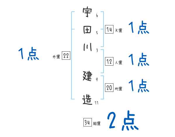 天運![]() | 宇田川建造さんの天運は14画の1つ星!人に対して優しいがストレスを溜め込みがち。人間関係のトラブルを避けるよう気をつけましょう。 家系が持つ宿命的な運勢を表します。祖先から受け継いだ苗字ですので自分の力が及びません。家柄を象徴します。 |